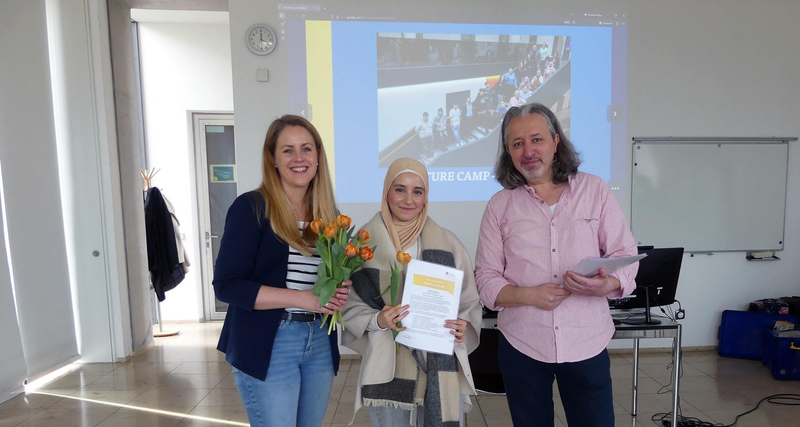 Auch unsere Förderer, Ivan Racic (Geschäftsführung) und Dana Bonertz (Managerin Förderprojekte, links auf dem Bild) von der Nikolaus Koch Stiftung, waren vor Ort. Sie überreichten feierlich die Abschlussurkunden.